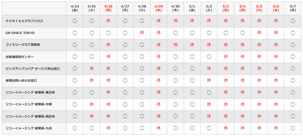 | リコーイメージング 修理係-東日本 | ○ | ○ | 休 | ○ | ○ | 休 | ○ | ○ | ○ | 休 | 休 | 休 | 休 | ○ |